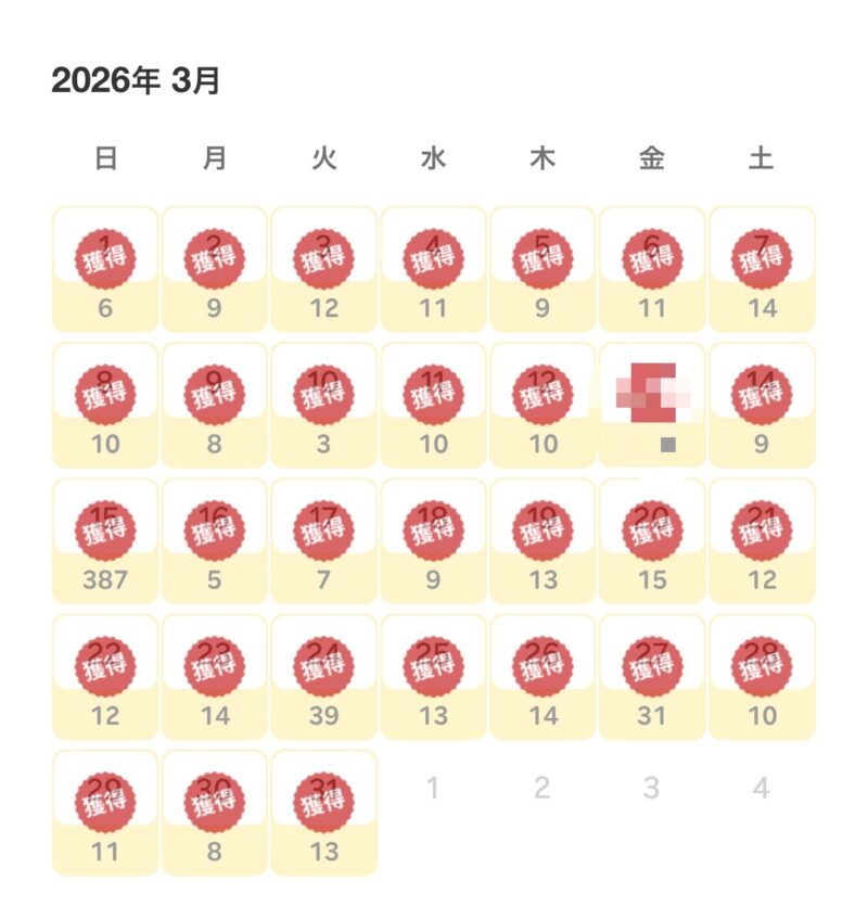 こちらは3月毎日続けたようですが3月中は一度も3ポイント、5ポイントは出なかった模様…